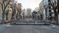 並木道と噴水がある都市の広場とオフィス街の景観